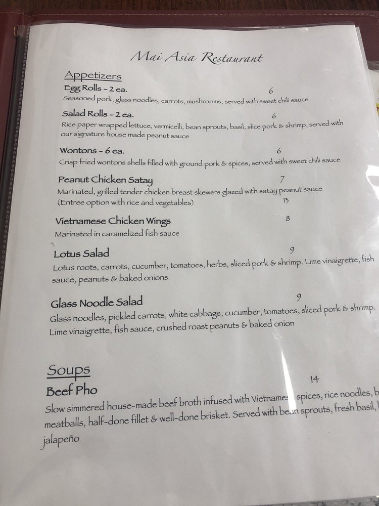 Mai Asia boasts an array of tantalizing dishes, with standout appetizers like their crispy egg rolls and salad rolls, both lauded by patrons for their fresh flavor and generous portions. The menu offers delightful noodle soups, including the renowned spicy noodle soup and crab meat soup, each brimming with a symphony of spices, fresh herbs, and vibrant ingredients.